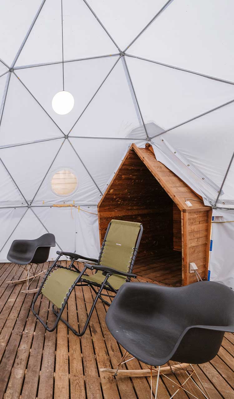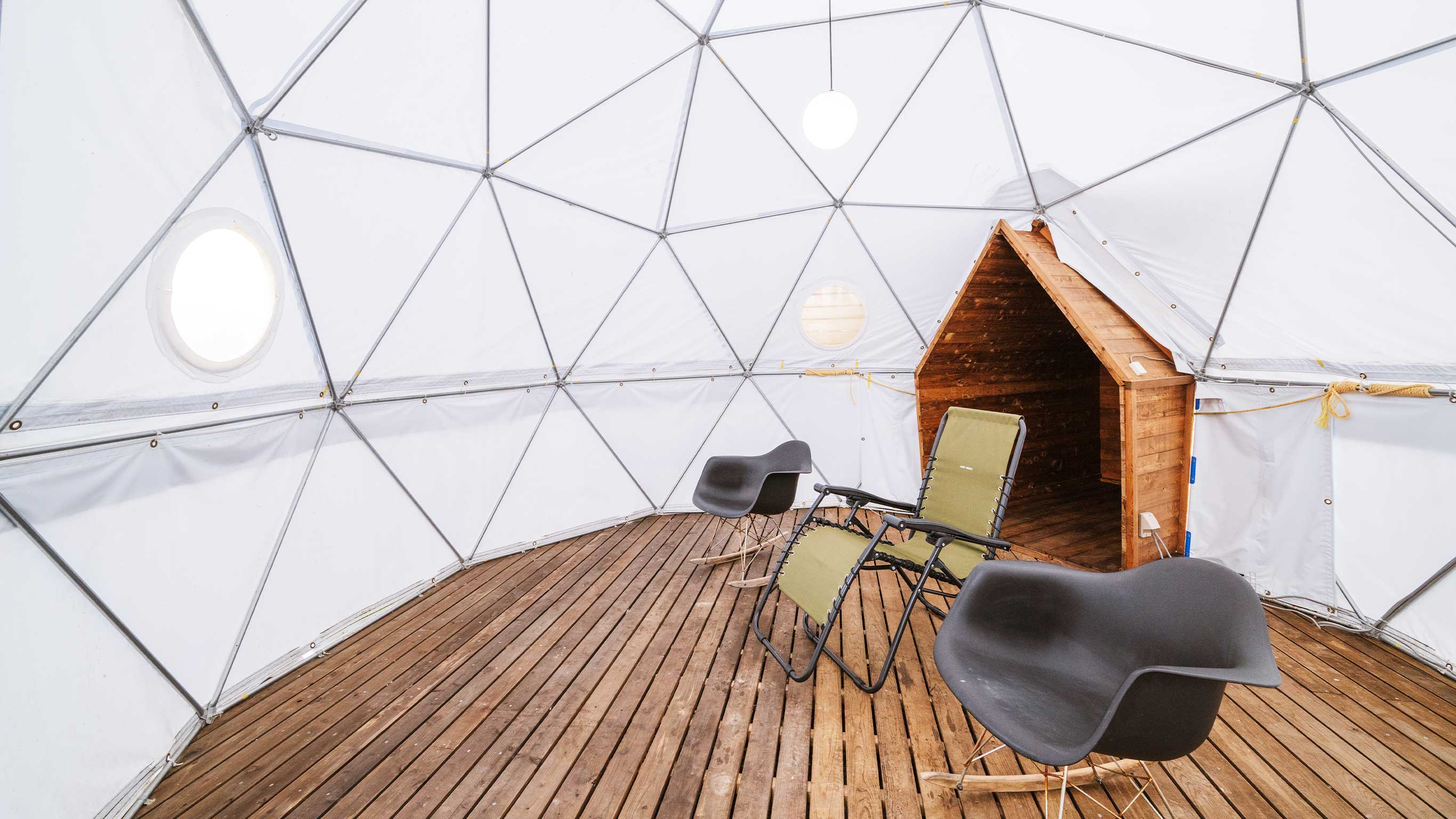 You are free, here I put a white, round dome tent in the small hill of the quiet village. Please spend gentle time leisurely relaxedly.